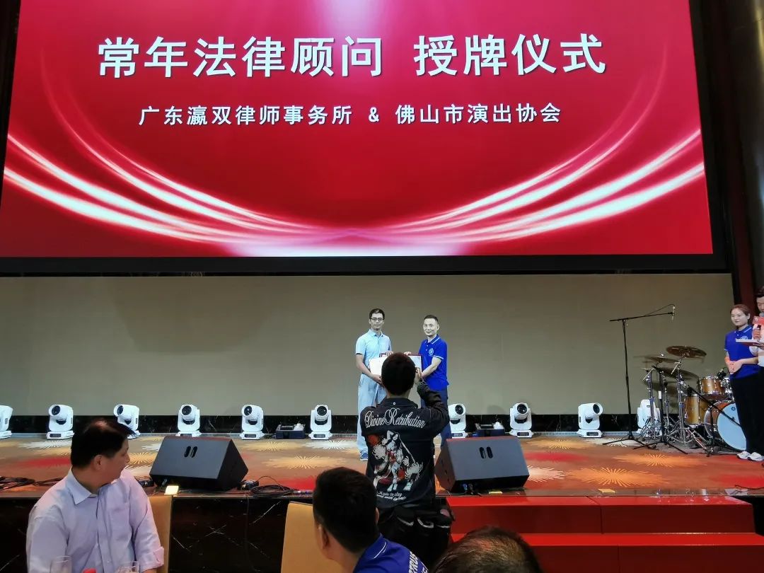 晚会后由佛山市演出协会刘伯平会长为叶日升律师发聘书,正式聘请我所作为演出协会的常年法律顾问。